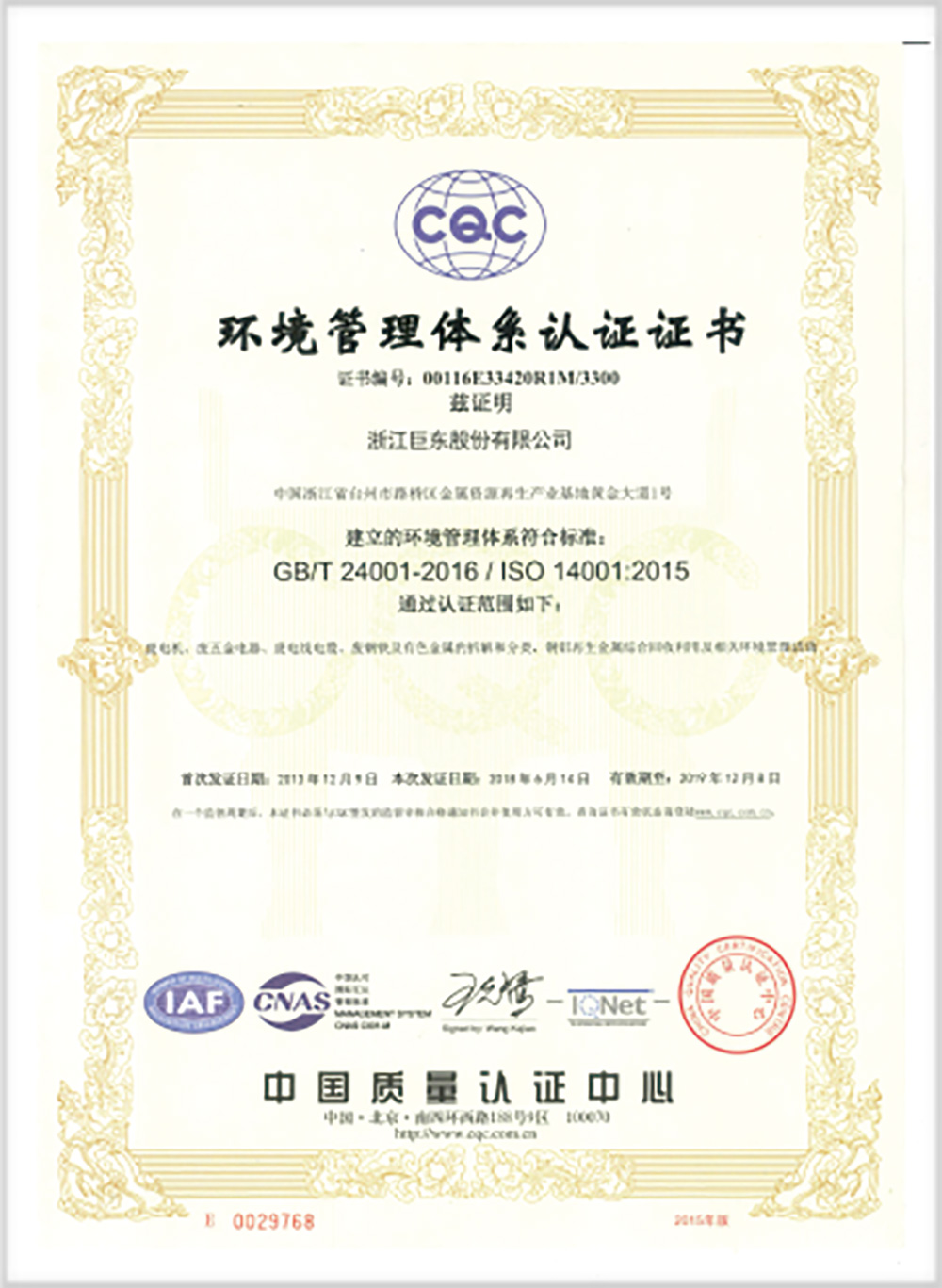 2018年6月取得ISO14001認(rèn)證