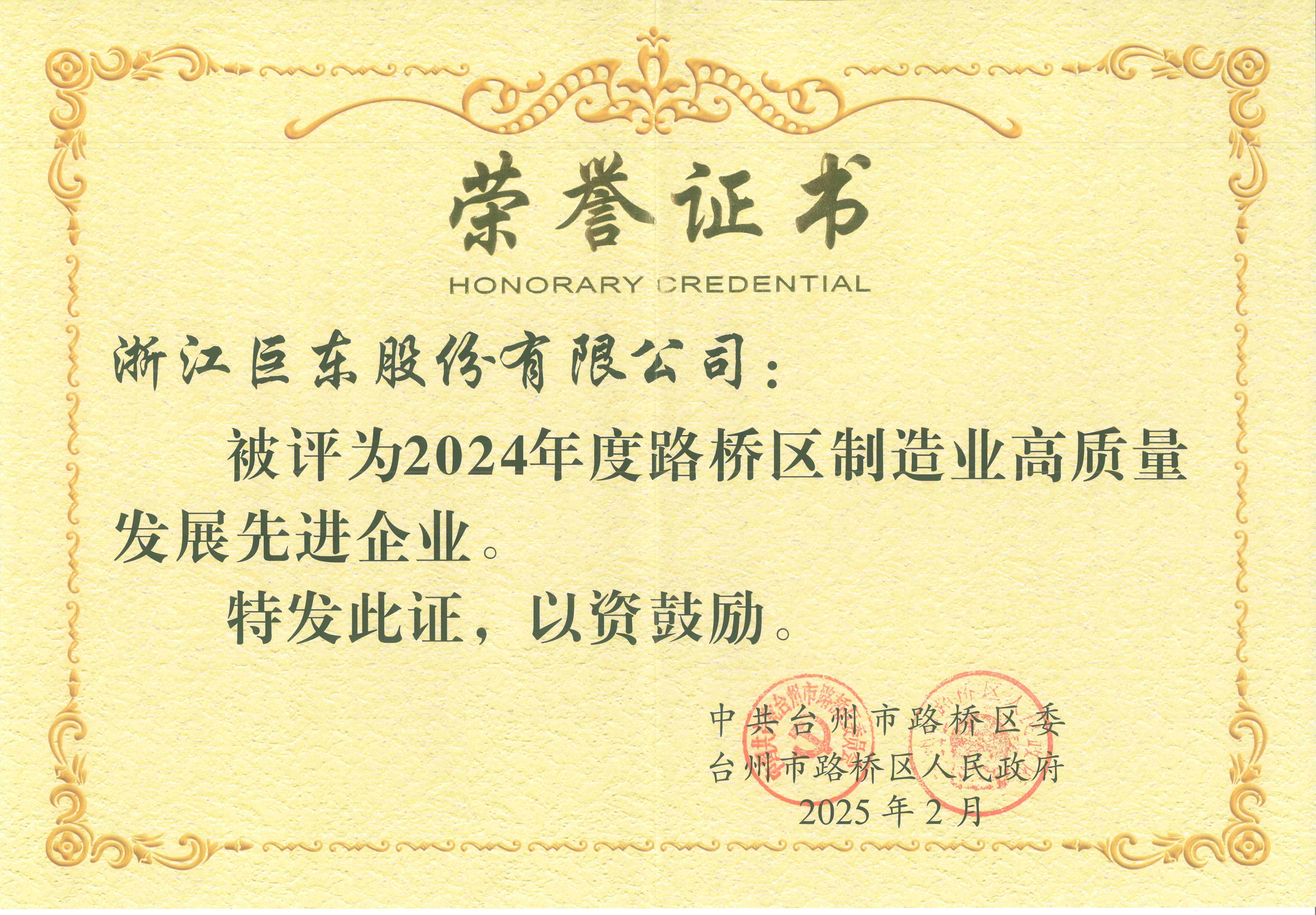 2024年度路橋區(qū)制造業(yè)高質(zhì)量發(fā)展先進(jìn)企業(yè)